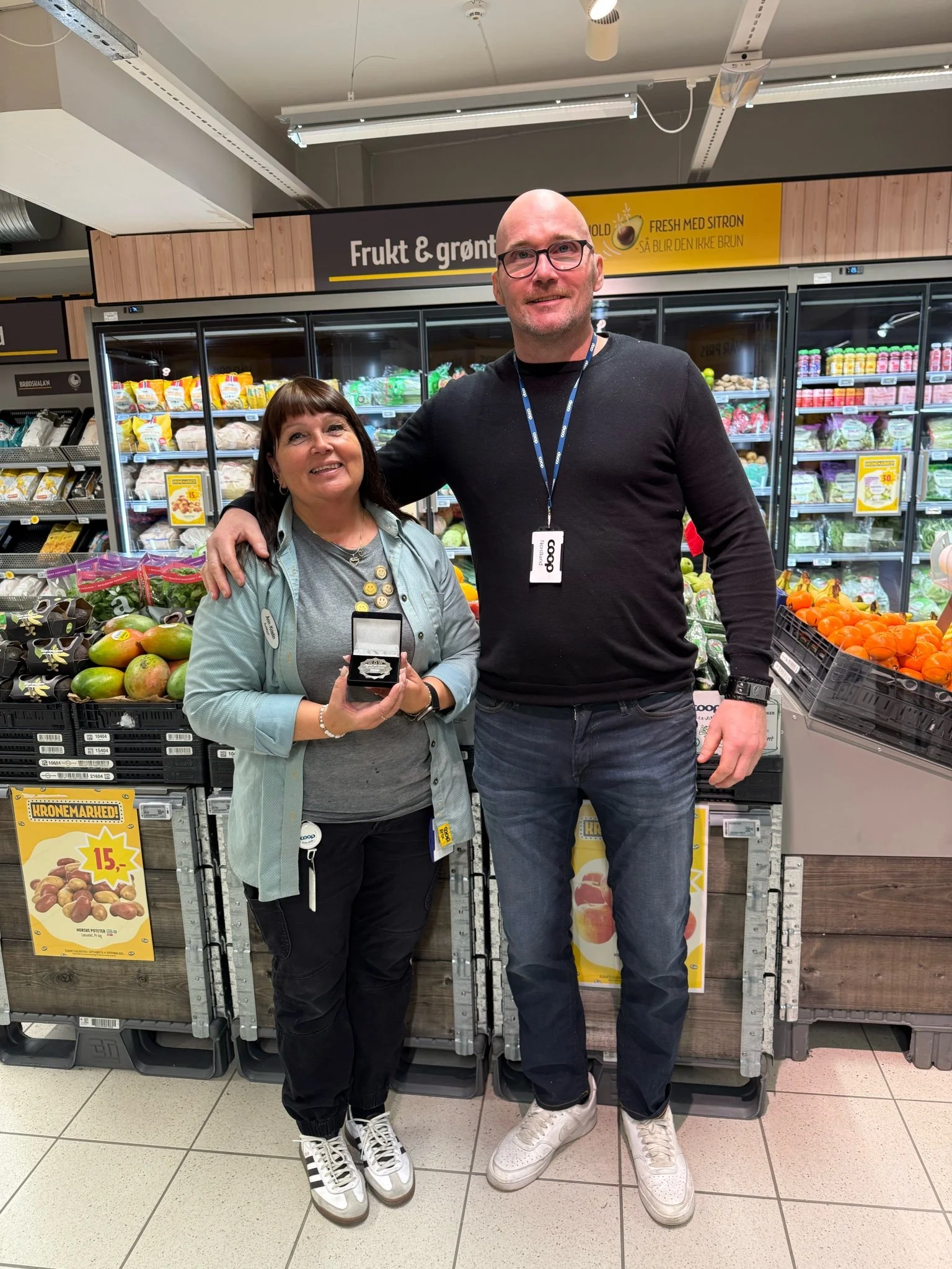 Ann-Kristin Kristiansen ved Coop Prix Helligberget har blitt kåret til årets "Stjernekollega" i andre kvartal i Coop Nordland. Her med driftsjef Tom Sagnes.